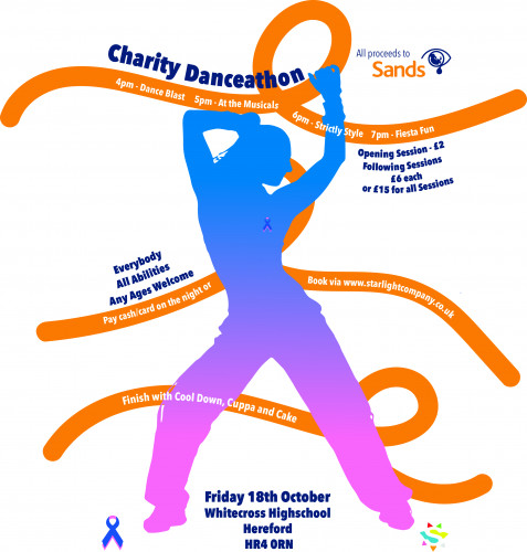 FRI 18TH OCTOBER FROM 4PM WHITECROSS HIGH SCHOOL JOIN US FOR AN EVENING OF DANCE TO RAISE MONEY FOR SANDS 4PM DANCE BLAST 5PM AT THE MUSICALS 6PM STRICTLY STYLE 7PM FIESTA FUN 8PM COOLDOWN CHAT CUPPA & CAKE