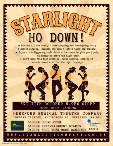 TICKET FOR THE STARLIGHT HO DOWN AT HMTC TOMKINS THEATRE, 148 Whitecross Rd, Hereford HR4 0DH FRI 11TH OCT 6-9PM DOORS OPEN 530PM ENTERTAINMENT 6PM FOOD SERVED FROM 7PM ENTERTAINMENT CONT UNTIL 9PM INCLUDED WITH TICKET: 1 HOT DOG (VEGGIE & GLUTEN FREE OPTION) GLASS OF WATER/SQUASH, ICECREAM (CHOC ICE) OR FRUIT, EVENING ENTERTAINMENT! LICENSED BAR OPEN (ADDITONAL) RAFFLE FOR ALZHEIMERS (ADDITIONAL)