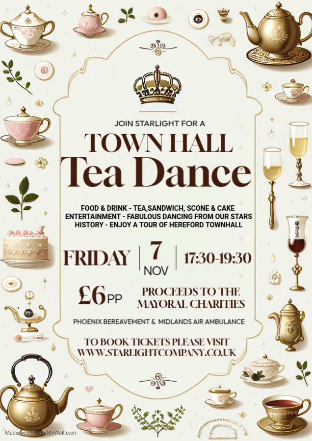 JOIN STARLIGHT FOR A TEA DANCE AT HEREFORD TOWN HALL FRI 7TH NOV 530-730PM FOOD, DRINK & ENTERTAINMENT FOR ALL THE FAMILY (Click on the link below to purchase tickets!)